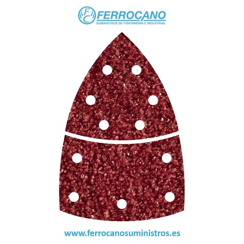 Dos piezas de hojas de esmerilado autoadhesivas diseñadas para trabajar en madera y metal, con un grano de corindón de 60 y una forma triangular de 95 mm, junto con su correspondiente base.
