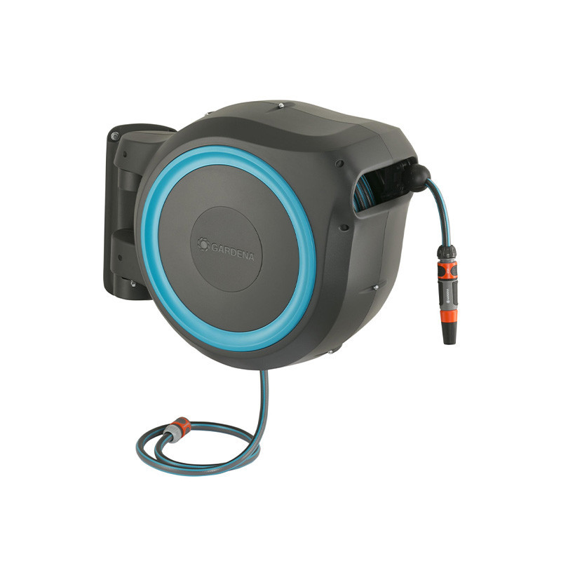 Con solo un ligero tirón, la manguera se recoge automáticamente gracias a su sistema de resorte de acero de alta calidad y a la innovadora tecnología RollControl, que asegura un enrollado suave, uniforme y controlado. Además, su guía de manguera integrada evita torceduras y daños, ofreciendo un riego siempre eficiente.