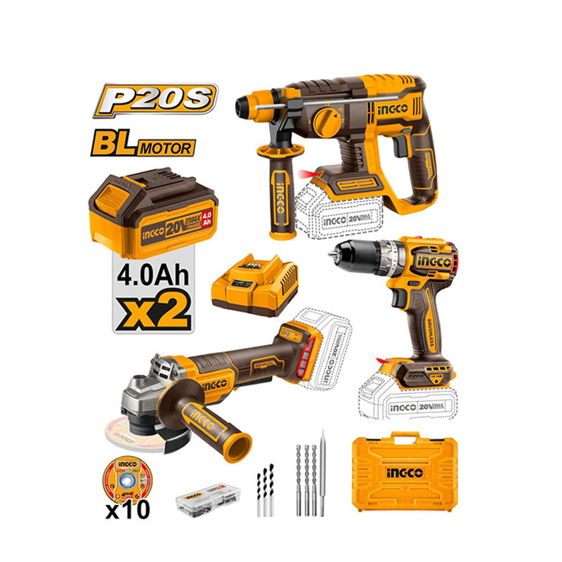El completo pack de herramientas inalámbricas 20V de INGCO ofrece potencia, autonomía y rendimiento profesional en un solo maletín. Incluye taladro de impacto, amoladora angular, martillo perforador, 2 baterías de 4.0Ah, cargador y accesorios.