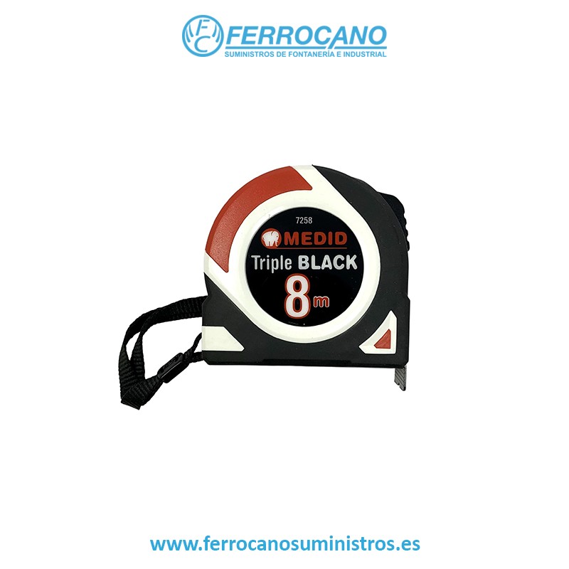 El flexómetro MEDID Black Tri-Mat de 8 metros y 25 mm es una herramienta profesional de alta visibilidad, precisión y durabilidad, diseñada para trabajos exigentes en construcción, instalaciones y bricolaje avanzado. Cuenta con un estuche ergonómico recubierto de Elastollan antideslizante, que mejora el agarre y la resistencia al uso intensivo. Su cinta de acero recubierta de nylon, impresa en ambas caras, garantiza una lectura clara, rápida y duradera incluso en condiciones de trabajo exigentes.
