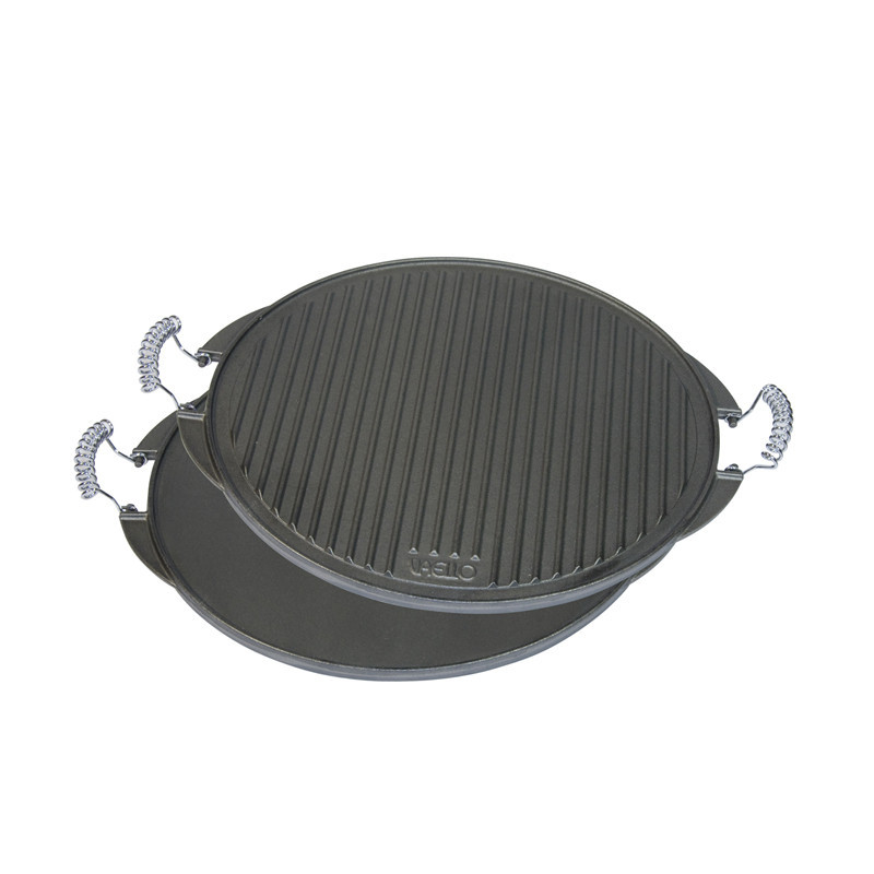 Descubre la plancha de hierro fundido de doble cara, diseñada para ofrecer resultados profesionales en tus preparaciones. Con una cara lisa y otra ondulada, esta plancha es ideal para cocinar carnes, verduras, pescados y más, adaptándose a todo tipo de recetas.