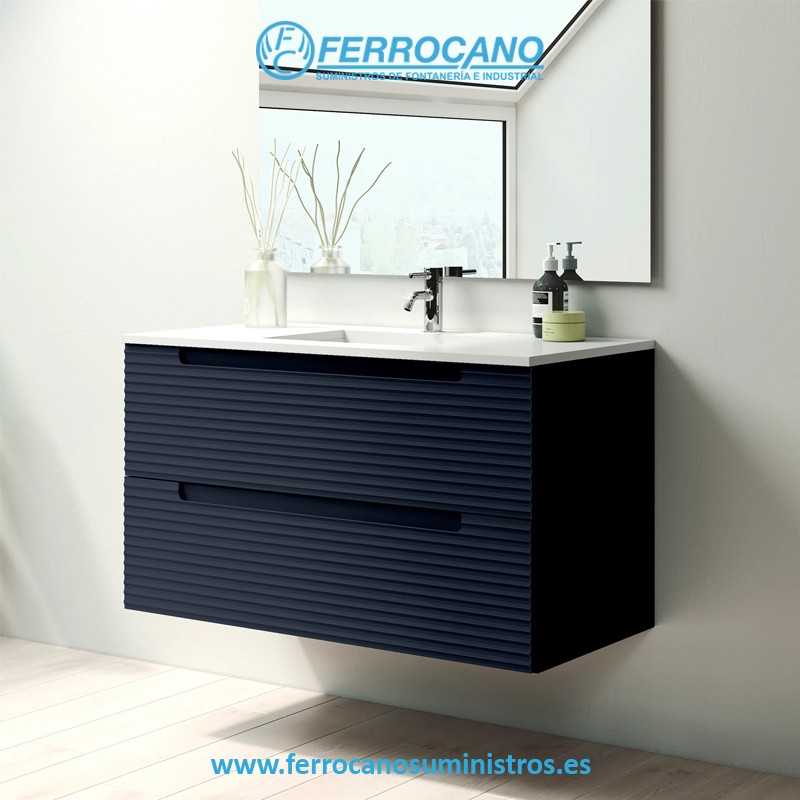 El conjunto incluye el lavabo cerámico Flat, asegurando compatibilidad y eliminando la necesidad de buscar un lavabo adicional. Presentado en un elegante tono navy.