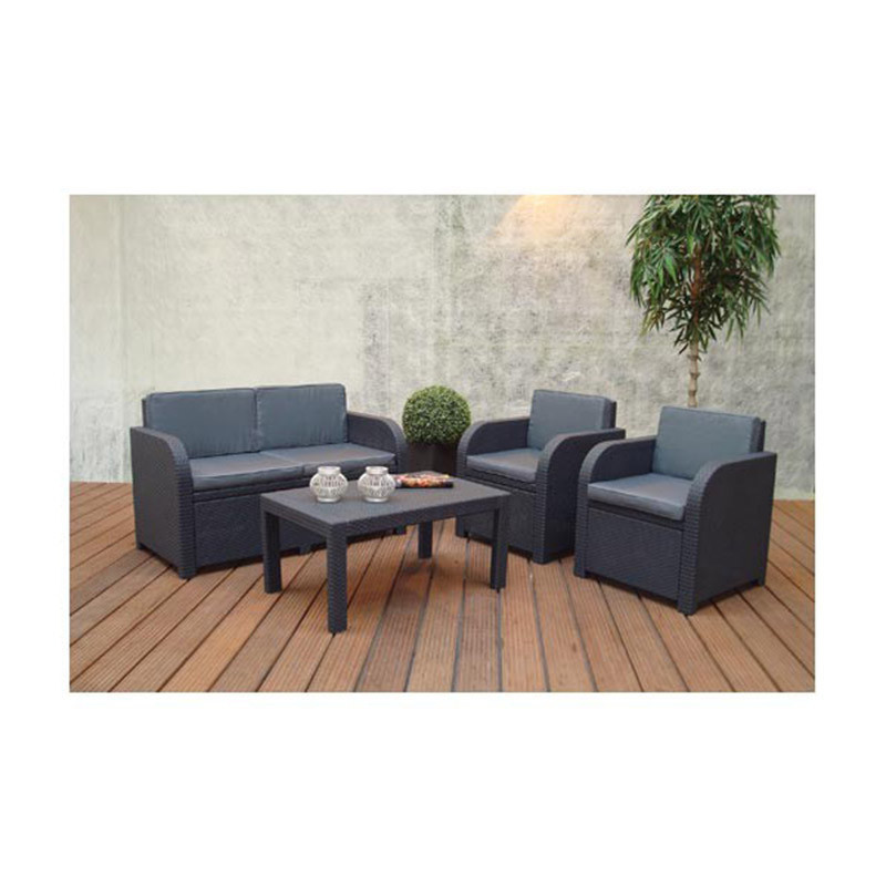 CONJUNTO DE MUEBLES DE SALA: SOFÁ DE 2 PLAZAS, 2 SILLONES INDIVIDUALES Y MESA BAJA. Hechos con una estructura de ratán plano de resina en elegante gris antracita, este conjunto incluye cojines en tono gris tanto para los asientos como para los respaldos. La mesa tiene unas dimensiones de 92 x 59 x 43 cm, los sillones miden 65 x 65 x 77 cm, y el sofá cuenta con medidas de 129 x 67 x 77 cm.