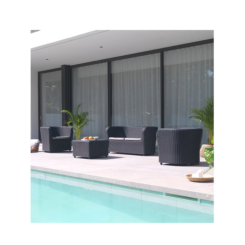 La estructura está hecha de ratán redondo de resina en tono gris antracita, e incluye cojines grises. El sillón tiene unas dimensiones de 79.3 x 70.7 x 68 cm, y la mesa/baúl mide 63 x 63 x 41 cm.