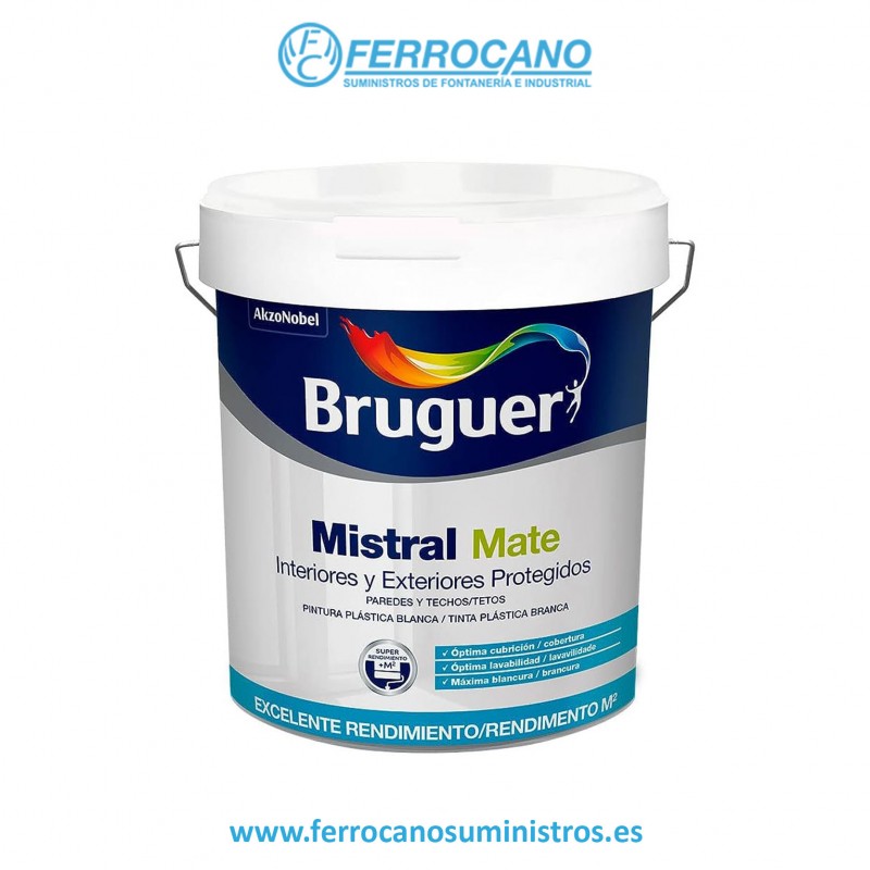Pintura plástica blanco mate de la gama Mistral de Bruguer, ideal para paredes y techos en interiores y exteriores. Proporciona máxima blancura y buena cobertura, con fácil aplicación con brocha, rodillo o pistola y rápido secado entre manos (≈ 30 min). Es un producto lavable y resistente, que ayuda a proteger y embellecer superficies ofreciendo un acabado mate uniforme y duradero.