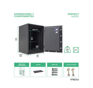 La caja fuerte Arregui Perfect electrónica de doble seguridad ofrece una protección superior frente al robo y al fuego, combinando certificaciones europeas de alta exigencia con una construcción robusta en acero. Su instalación no requiere obra y, gracias a su diseño plano sin puntos de apalancamiento, proporciona un nivel de seguridad profesional tanto para viviendas como para negocios. Incluye tornillería y un punto de anclaje para fijarla y maximizar su resistencia frente a intentos de extracción.