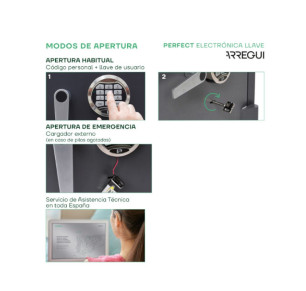 - Doble seguridad: cerradura electrónica con teclado + cerradura mecánica de llave de doble paletón; apertura asistida con manilla.