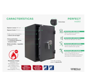 - Certificación antirrobo Grado 1 EN 1143-1 y resistencia ignífuga LFS 60P EN 15659, manteniendo el interior por debajo de 170 °C durante 60 minutos.