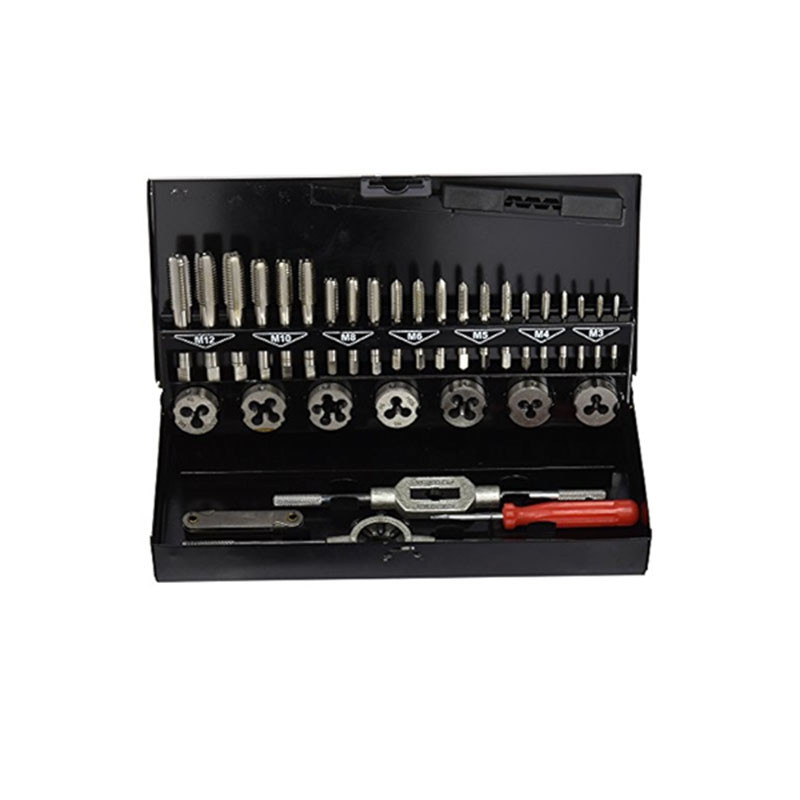 Juego de machos y terrajas ideal para tus proyectos de roscado. Incluye herramientas de alta precisión y durabilidad, perfectas para crear roscas internas y externas. Ideal para profesionales y aficionados del bricolaje. Mejora tu eficiencia con este completo set de herramientas de roscado.