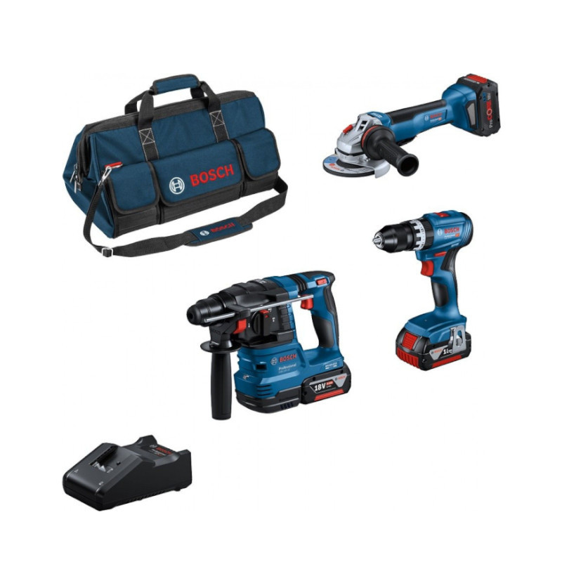 El pack Bosch Profesional 18V es un completo combo de herramientas eléctricas a batería diseñado para ofrecer potencia, autonomía y máxima versatilidad en trabajos de construcción, instalación y mantenimiento. Este kit reúne tres herramientas esenciales —taladro percutor, amoladora angular y martillo perforador SDS-Plus— junto con baterías de alto rendimiento, cargador y bolsa de transporte, proporcionando una solución integral para taladrar, atornillar, cortar, desbastar y perforar hormigón con la fiabilidad del sistema Bosch Professional 18V.