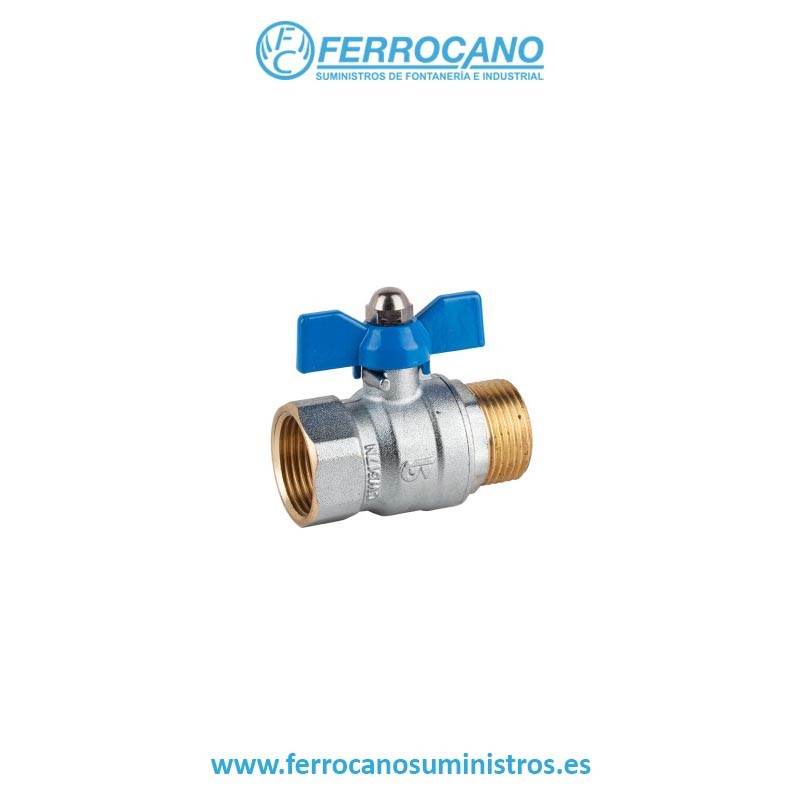 Presión nominal de 25. Flujo sin restricciones. El cuerpo está fabricado en latón cromado según la norma UNE-EN 12165. Los asientos están hechos de PTFE. Los extremos tienen rosca de gas (BSP) macho-hembra según la norma ISO 228/1. La temperatura máxima permitida es de 110ºC. El control se realiza manualmente mediante una palomilla de aluminio.